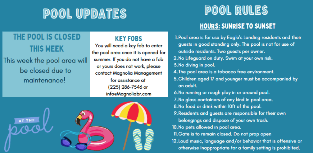 Please see the attachments regarding pool updates and pool rules and a reminder about this Friday’s Easter Eggstravaganza.